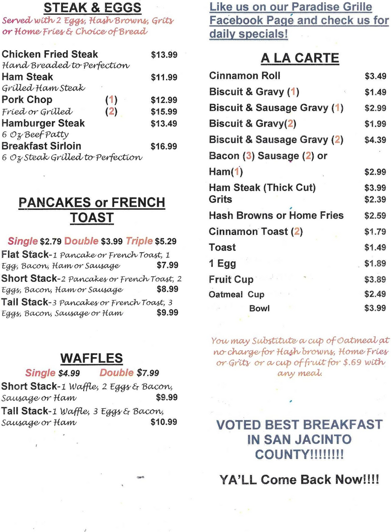 Product Item: Paradise shop grill menu