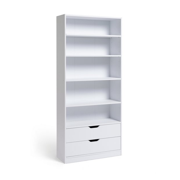 White bookshelf with shop drawers on bottom